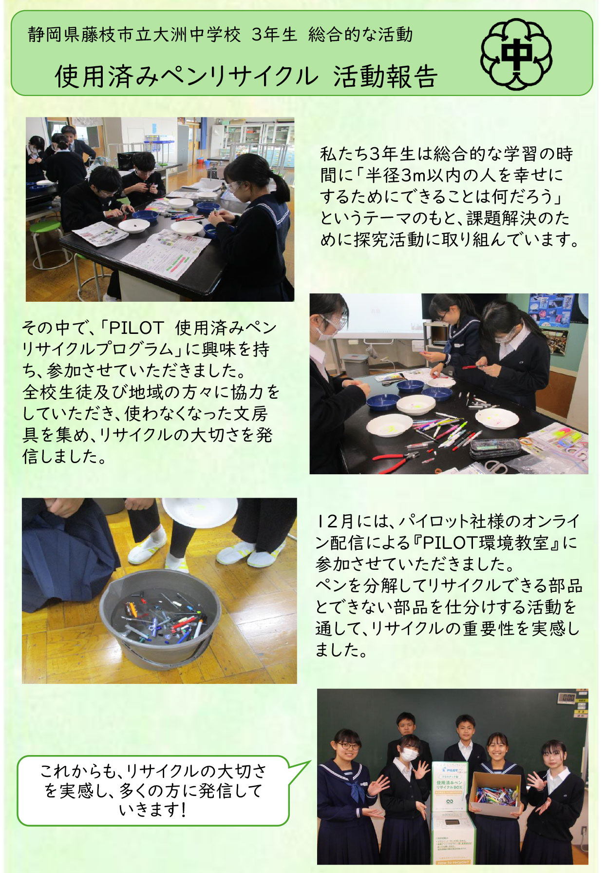このプログラムでは、使用済みのプラスチック製の筆記具を回収リサイクルすることで、環境負荷の低減ならびに循環型社会の実現の一助となる事を目的としています。